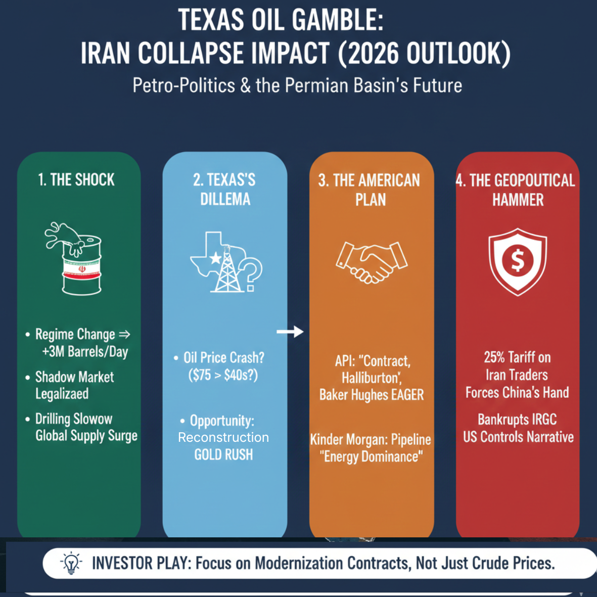 Texas-based giants like Halliburton and Baker Hughes are reportedly already drafting “Day After” contingency plans. The goal? To pivot from seeing Iran as a sanctioned rival to a massive reconstruction client.